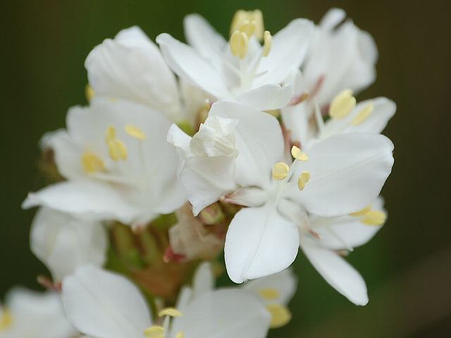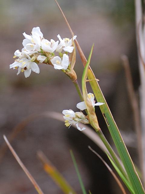 花茎の先に数輪ずつ小さな白い花をつける。