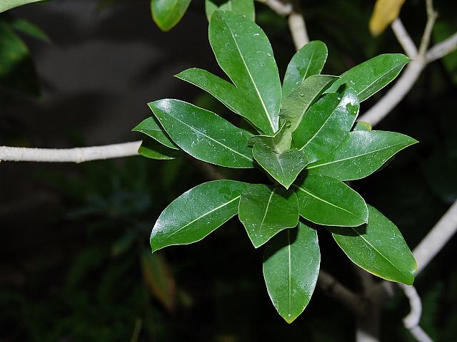 葉は長い楕円形で、枝先付近に集まって輪生状に互い違いに生える(互生)。