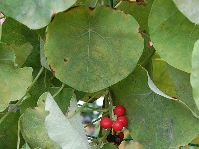 玉咲き葛藤(タマザキツヅラフジ)はツヅラフジ科ハスノハカズラ属(ステファニア属)の蔓性多年草である。