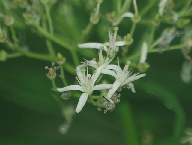 枝先や葉の脇から集散花序(最初の花が枝先につき、その下に次々と側枝を出して花がつく)を出し、小さな白い5弁花をつける。
