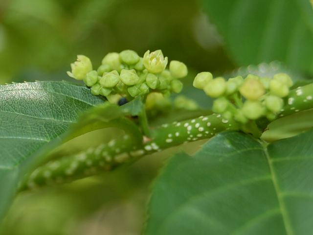 枝先に円錐花序(下のほうになるほど枝分かれする回数が多く、全体をみると円錐形になる)を出し、黄緑色の小さな花をたくさんつける。
