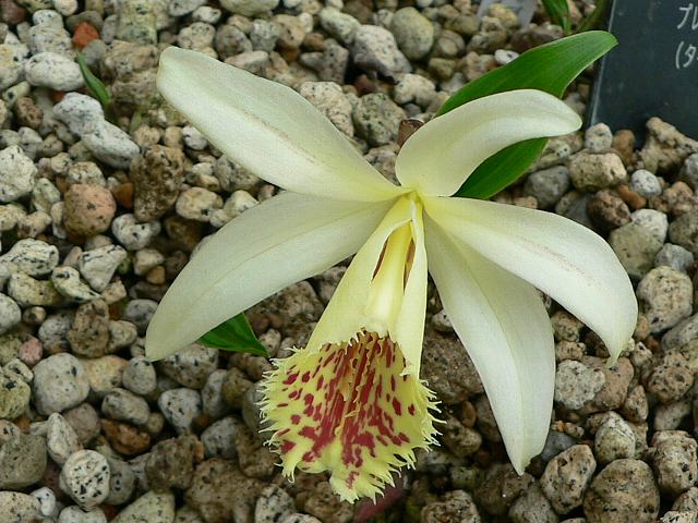 花の色は淡い黄色で、大きな唇弁には赤い斑が入る。