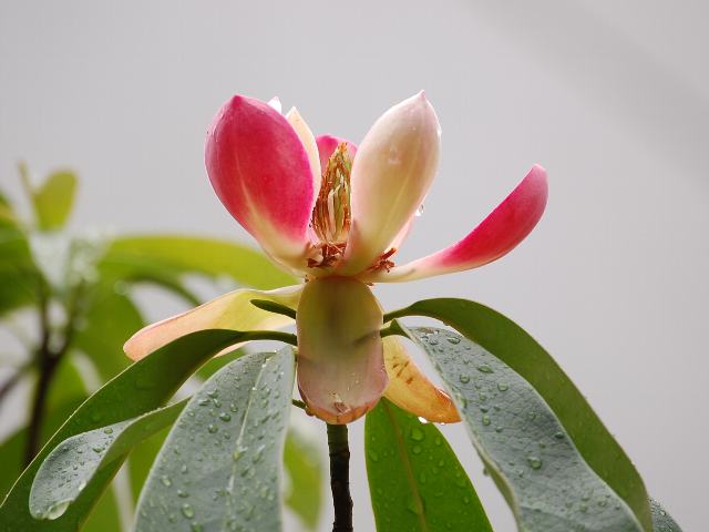 花の色は白にピンクが混じり、朴の木(ホオノキ)を小形にした感じである。
