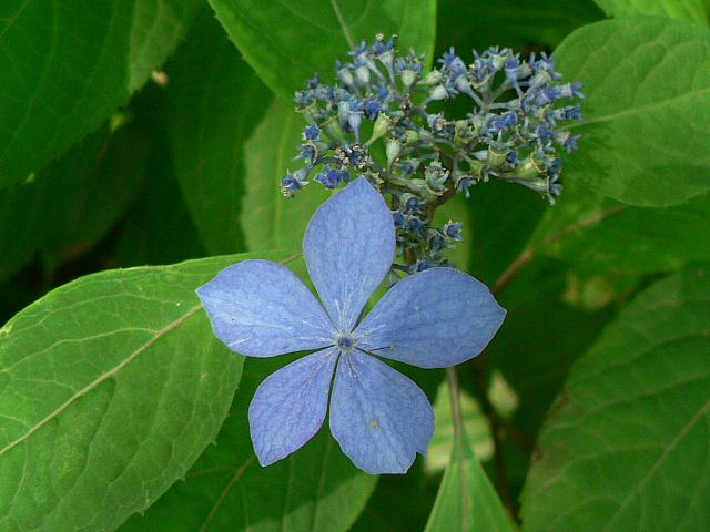 装飾花の真ん中に両性花があり、水色をしている。